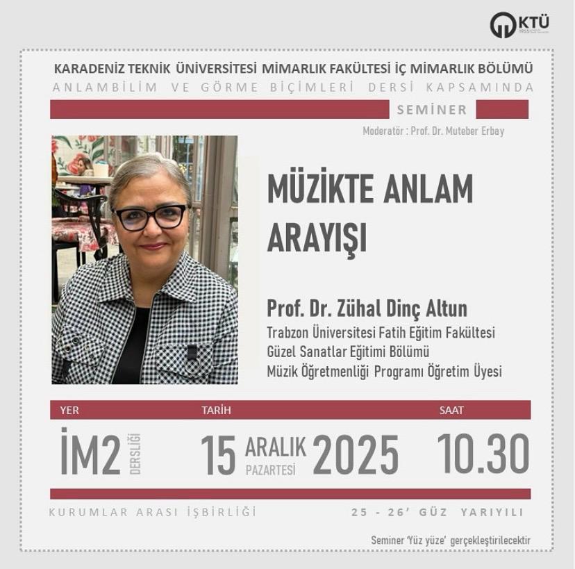 Karadeniz Teknik Üniversitesi Mimarlık Fakültesi İç Mimarlık Bölümü tarafından, Anlambilim ve Görme Biçimleri dersi kapsamında 15 Aralık 2025 Pazartesi günü “Müzikte Anlam Arayışı” başlıklı seminer gerçekleştirildi.