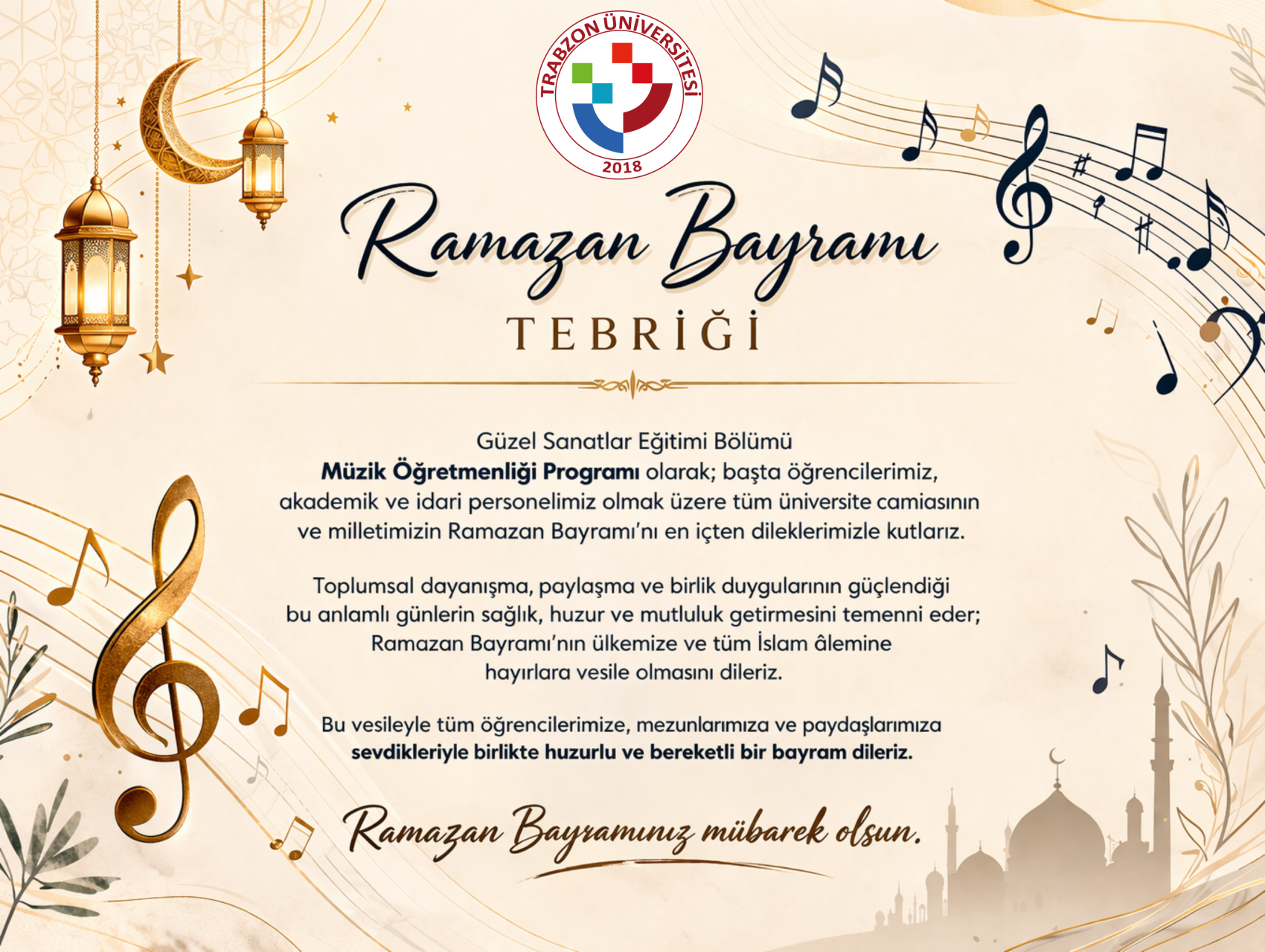 Güzel Sanatlar Eğitimi Bölümü Müzik Öğretmenliği Programı olarak; başta öğrencilerimiz, akademik ve idari personelimiz olmak üzere tüm üniversite camiasının ve milletimizin Ramazan Bayramı’nı en içten dileklerimizle kutlarız.